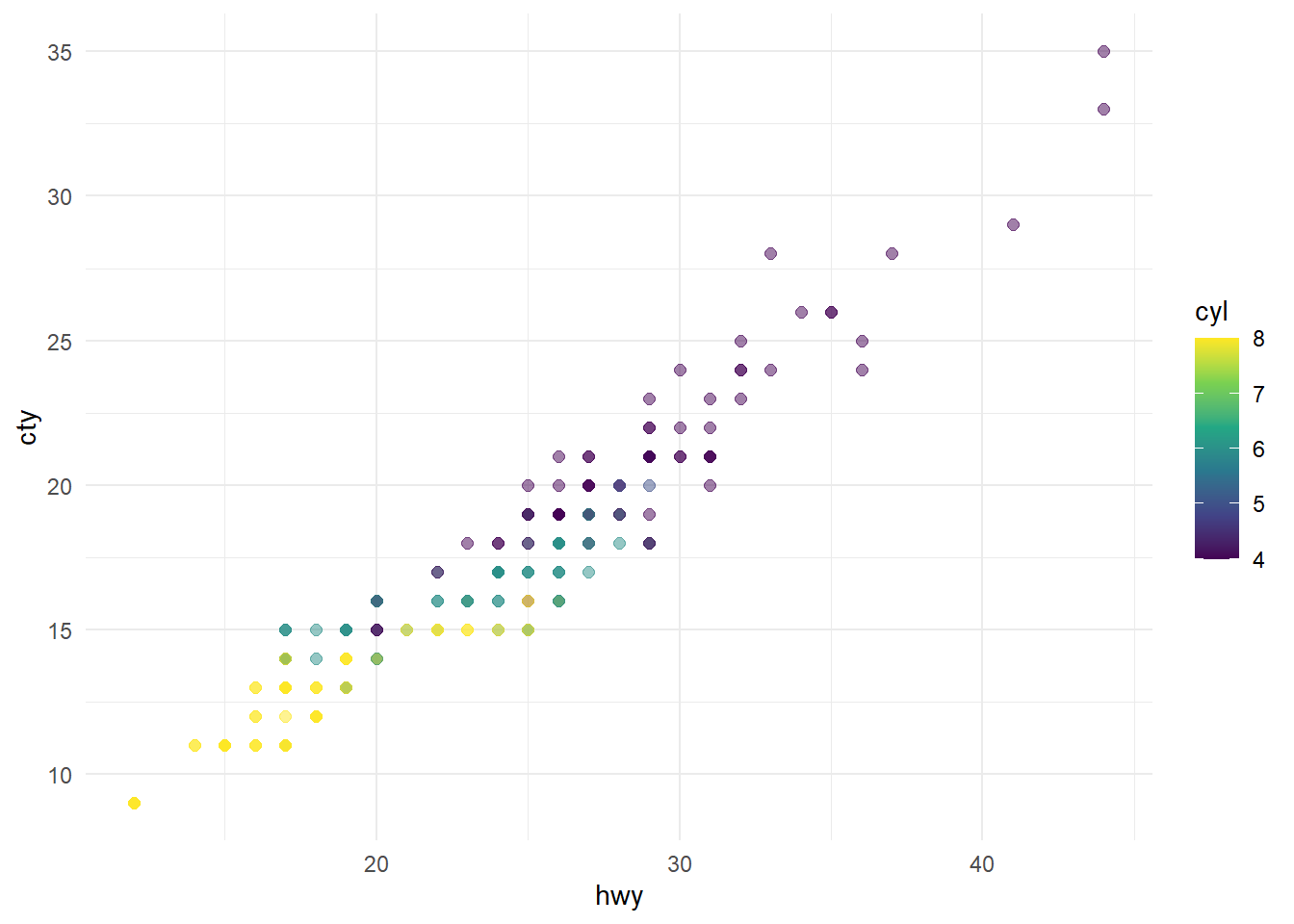```{r}#| label: fig-scatterplot#| fig-cap: "City and highway mileage for 38 popular models of cars."#| fig-alt: "Scatterplot of city vs. highway mileage for cars, where points are colored by the number of cylinders. The plot displays a positive, linear, and strong relationship between city and highway mileage, and mileage increases as the number of cylinders decreases."#| fig-width: 6#| fig-height: 3.5#| code-line-numbers: trueggplot(mpg, aes(x = hwy, y = cty, color = cyl)) +geom_point(alpha =0.5, size =2) +scale_color_viridis_c() +theme_minimal()```