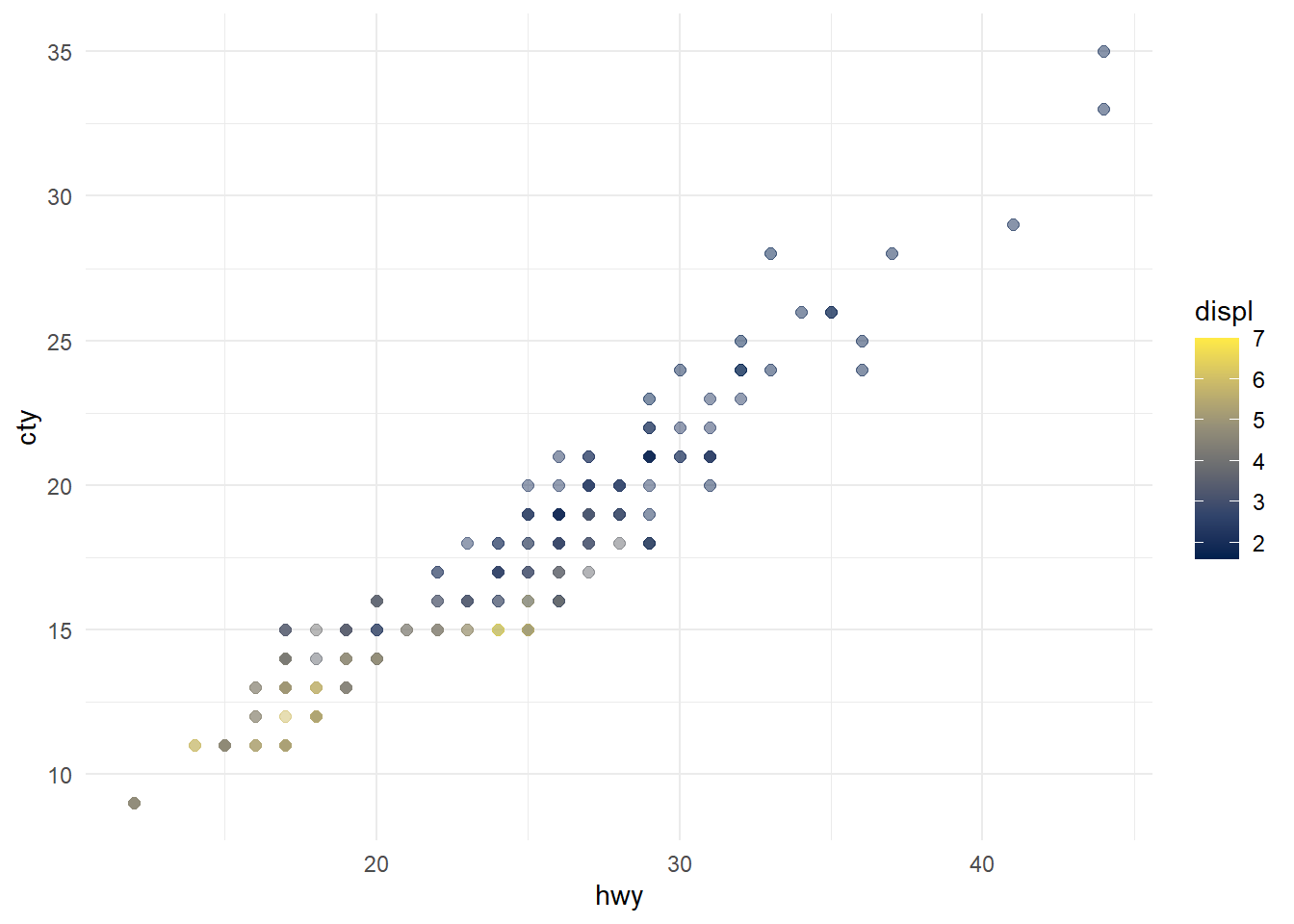 The plots in Figure 4 show the relationship between city and highway mileage for 38 popular models of cars. In Figure 4 (a) the points are colored by the number of cylinders while in Figure 4 (b) the points are colored by engine displacement.